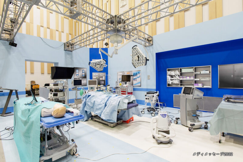 会場内には手術室が再現され、腹腔鏡手術の実演や情熱医療トークライブが行われます。手術の時にドクターの手元を照らす無影灯(むえいとう)をはじめ、麻酔器、心電モニター、人工心肺装置、電気メスなど、手術室の中にある本物の医療機器を配置していますので、ぜひご注目ください。