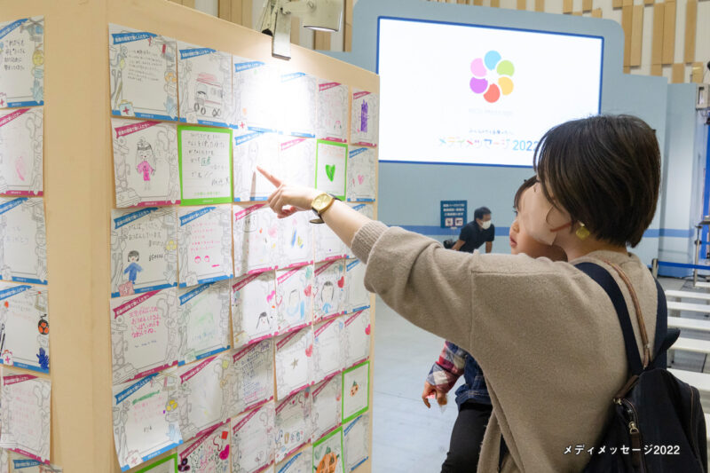 会場内にはメッセージの記入コーナーを設置しています。書いていただくのは、医療現場で働く皆様への応援メッセージ、そしてよりよい医療の実現を願う希望のメッセージです。会場内に掲示させていただくとともに、メディメッセージに協力していただいた先生方や医療関係者の皆様へ届けられます。