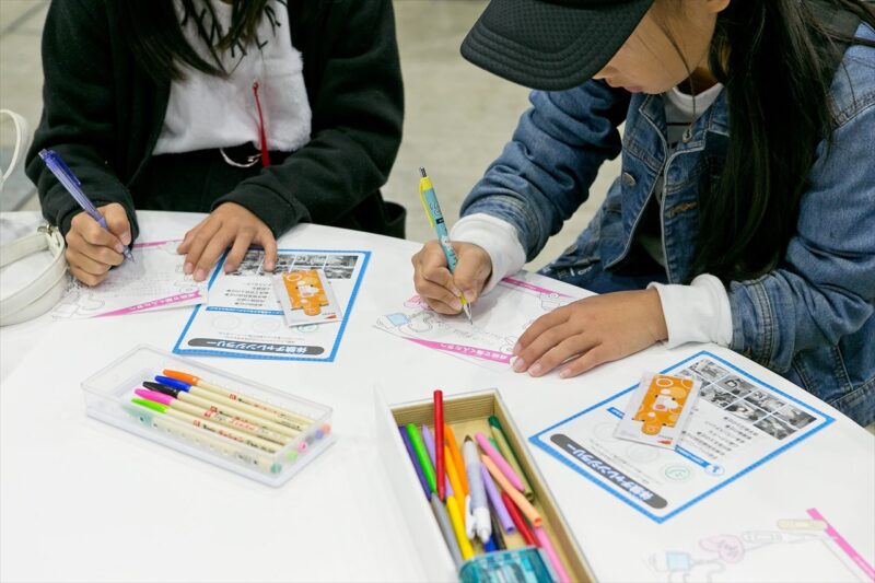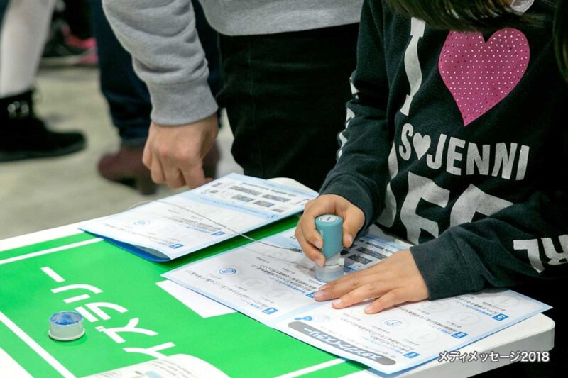 入場の際にスタンプラリーの台紙をお渡しします。会場内で体験したりクイズに答えたり、スタンプコーナーをまわってください。クイズのヒントは会場のパネルや動画の中に!わからないときは近くのスタッフからヒントをもらいましょう。